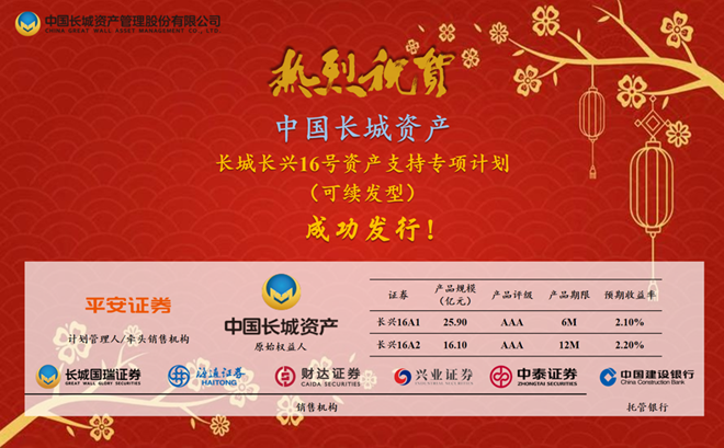 9月10日,中國(guó)長(zhǎng)城資產(chǎn)在上海證券交易所成功發(fā)行長(zhǎng)城長(zhǎng)興16號(hào)資產(chǎn)支持專項(xiàng)計(jì)劃。本期產(chǎn)品發(fā)行規(guī)模42.2億元,票面加權(quán)融資利率2.14%,其中優(yōu)先級(jí)A1檔發(fā)行規(guī)模25.9億元,期限6個(gè)月,發(fā)行利率2.1%;優(yōu)先級(jí)A2檔發(fā)行規(guī)模16.1億元,期限12個(gè)月,發(fā)行利率2.2%。